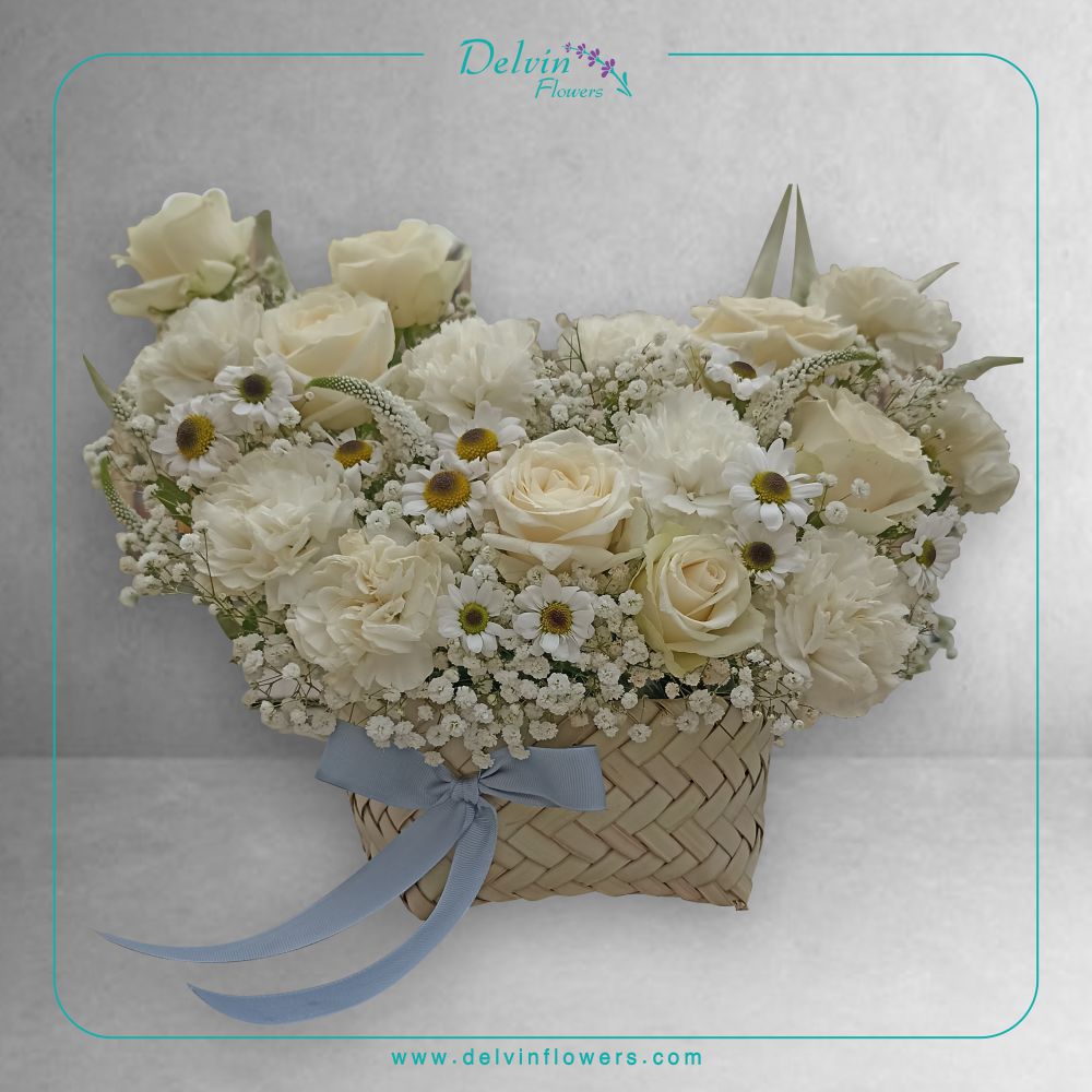 ترکیبی از گل های رز سفید ، داوودی سفید مشکی، ژیپسوفیلا، میخک