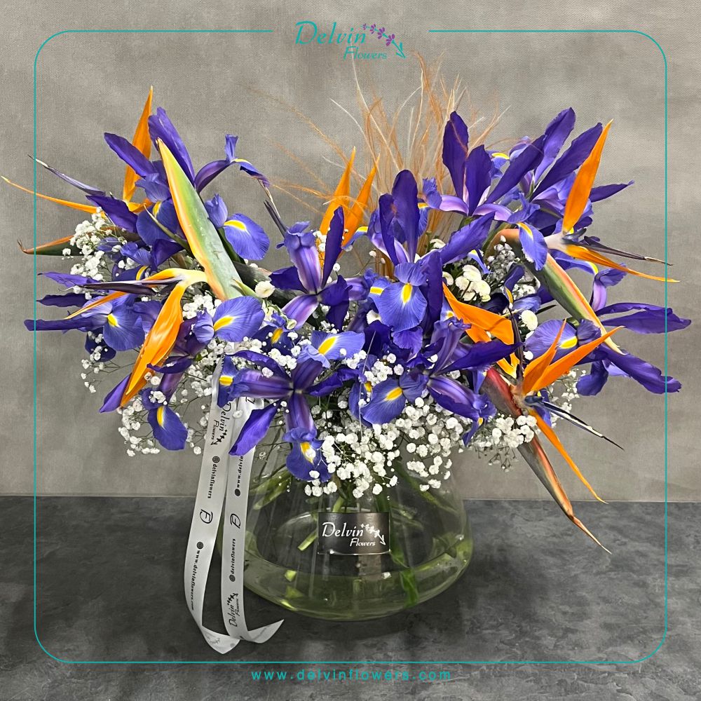 ترکیبی از گلهای: زنبق، پرنده بهشتی، ژیپسوفیلا