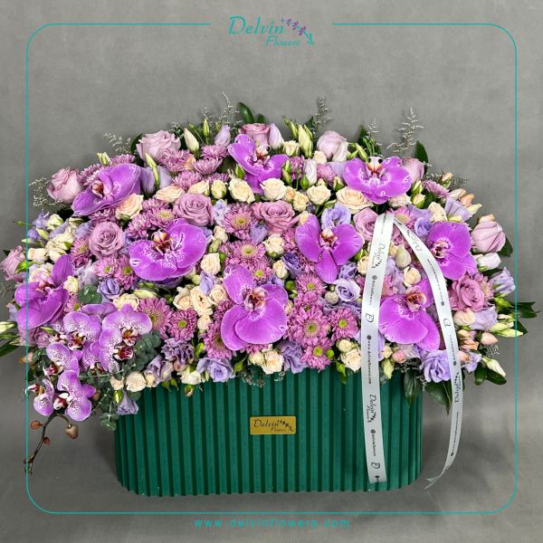 ترکیبی از گلهای: ارکیده، رز مینیاتوری، لیسینتوس، داوودی، اکالیپتوس و برگ آرایی