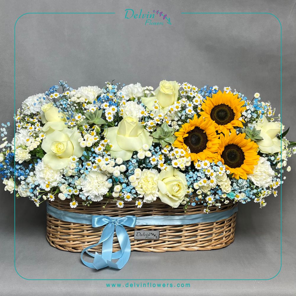ترکیبی از گلهای: رز، آفتابگردان، بابونه، ژیپسوفیلا، مخلصه، رز مینیاتوری، میخک، ساکولنت